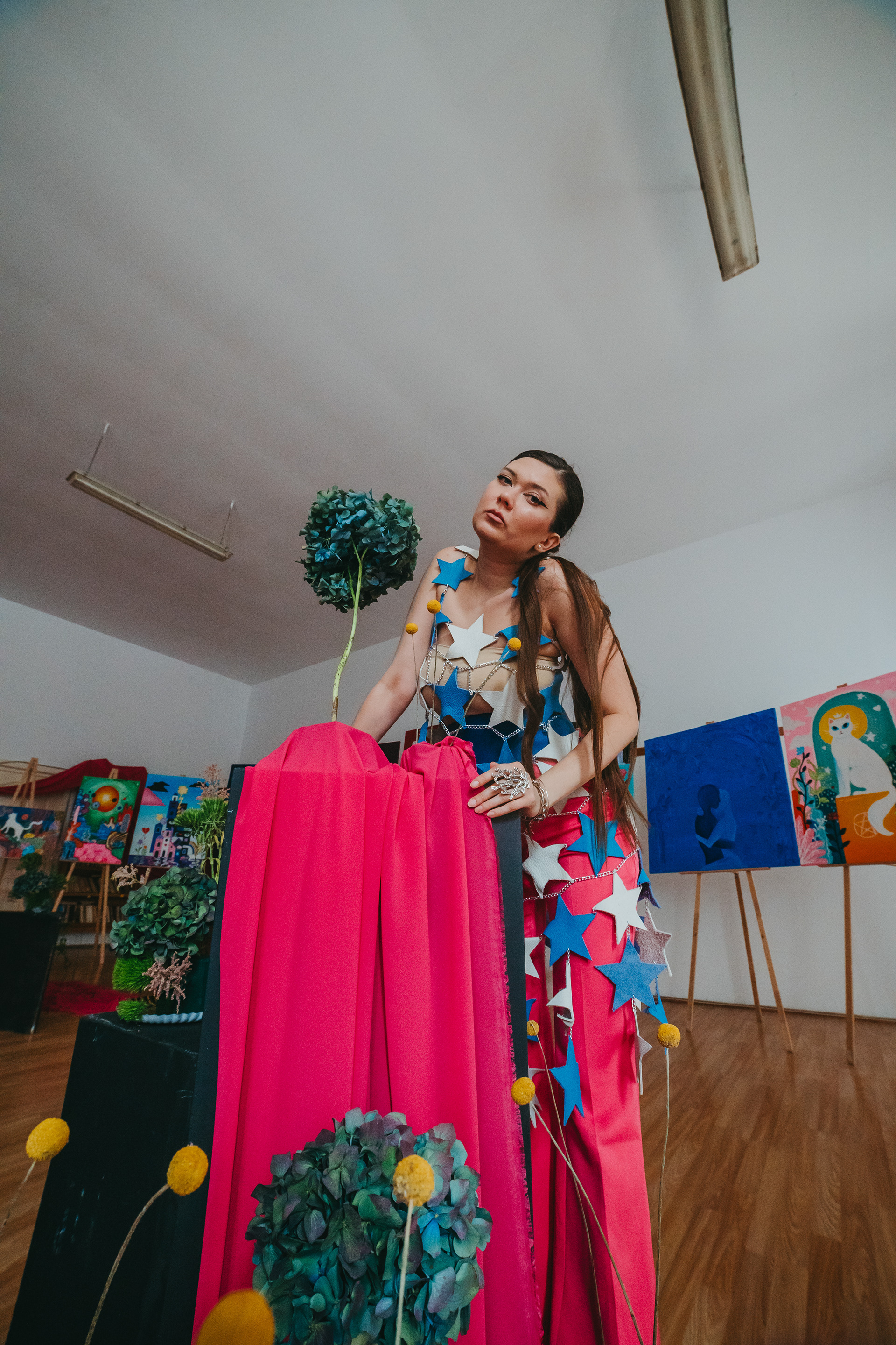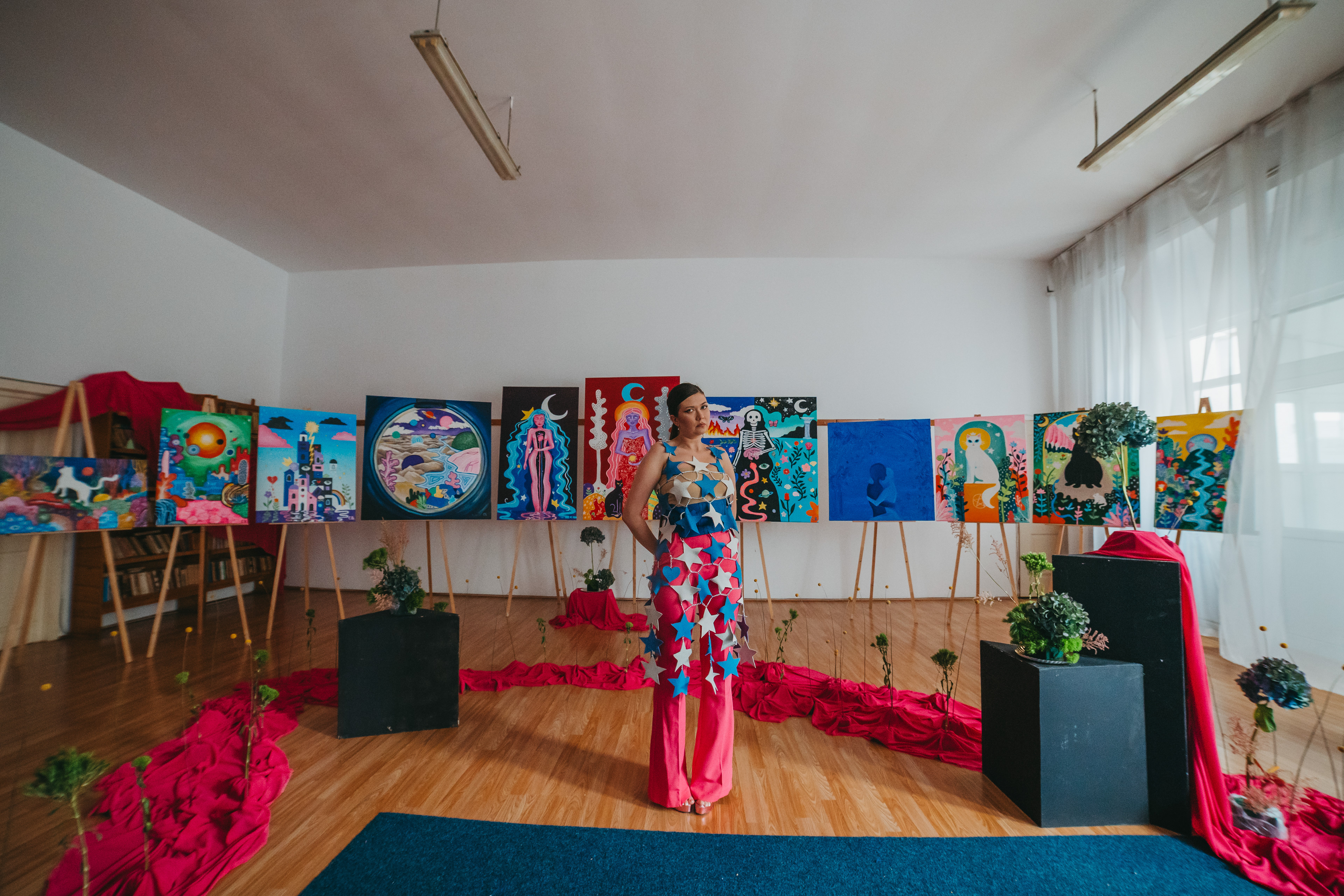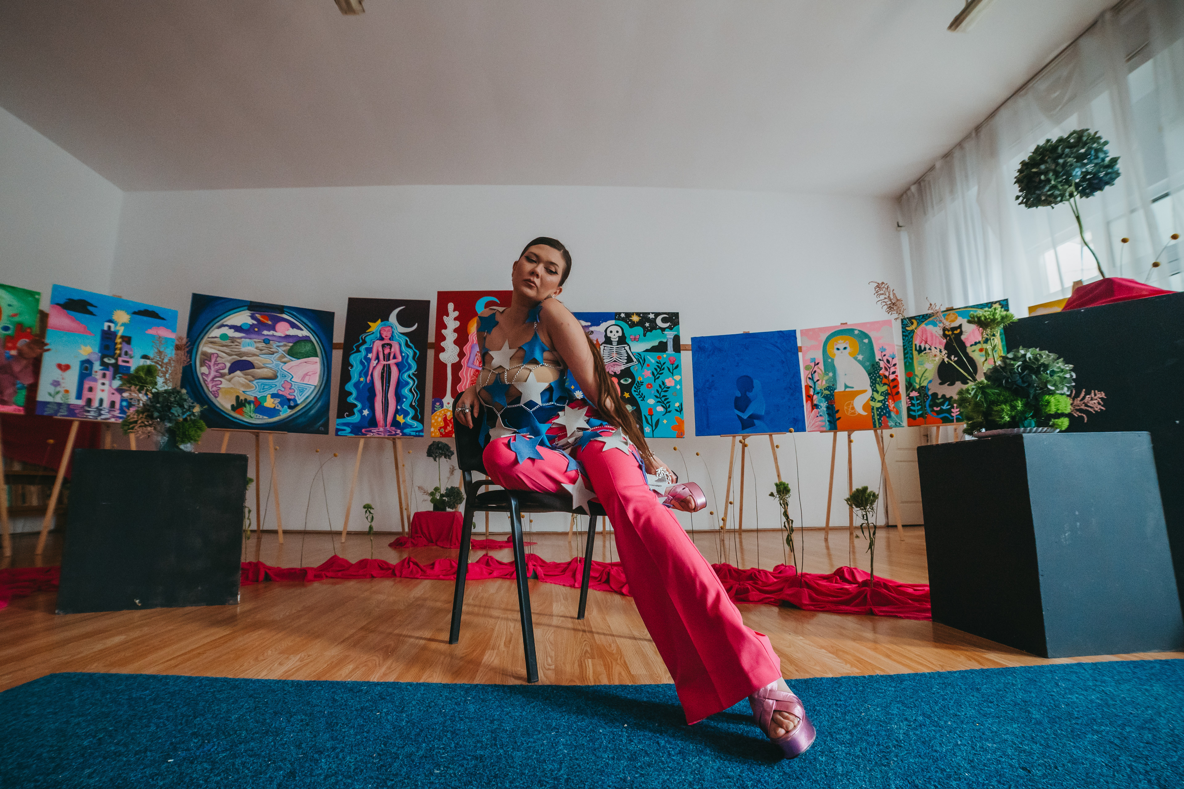 Unapologetically Divine is Cristina Bejan’s first major art exhibition, a visual journey through vulnerability, sensuality, healing, and self-discovery. The show combines large-scale paintings, interactive installations, and symbolic motifs inspired by spirituality, tarot, and the balance of feminine and masculine energies. For the vernissage, Cristina wore a handmade leather star set she designed and created herself under her brand Lunara, a statement outfit that embodied the exhibition’s themes of celestial power, self-expression, and unapologetic authenticity. Through this body of work, Cristina invites viewers into a space where fashion, art, and emotion merge, encouraging them to embrace their own divine essence.